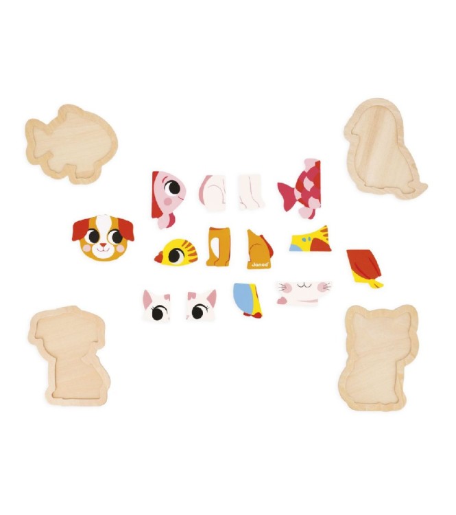 Esta bonita caja de regalo contiene 4 puzles evolutivos con la temática de los animales de compañía con: un pez de 2 piezas, un perro de 3 piezas, un loro de 4 piezas y un gato de 5 piezas. A su propio ritmo, su hijo reconstruirá los diferentes puzles, aumentando su dificultad. El producto está compuesto por 4 puzles de madera dispuestos sobre 4 bases que facilitan el montaje
